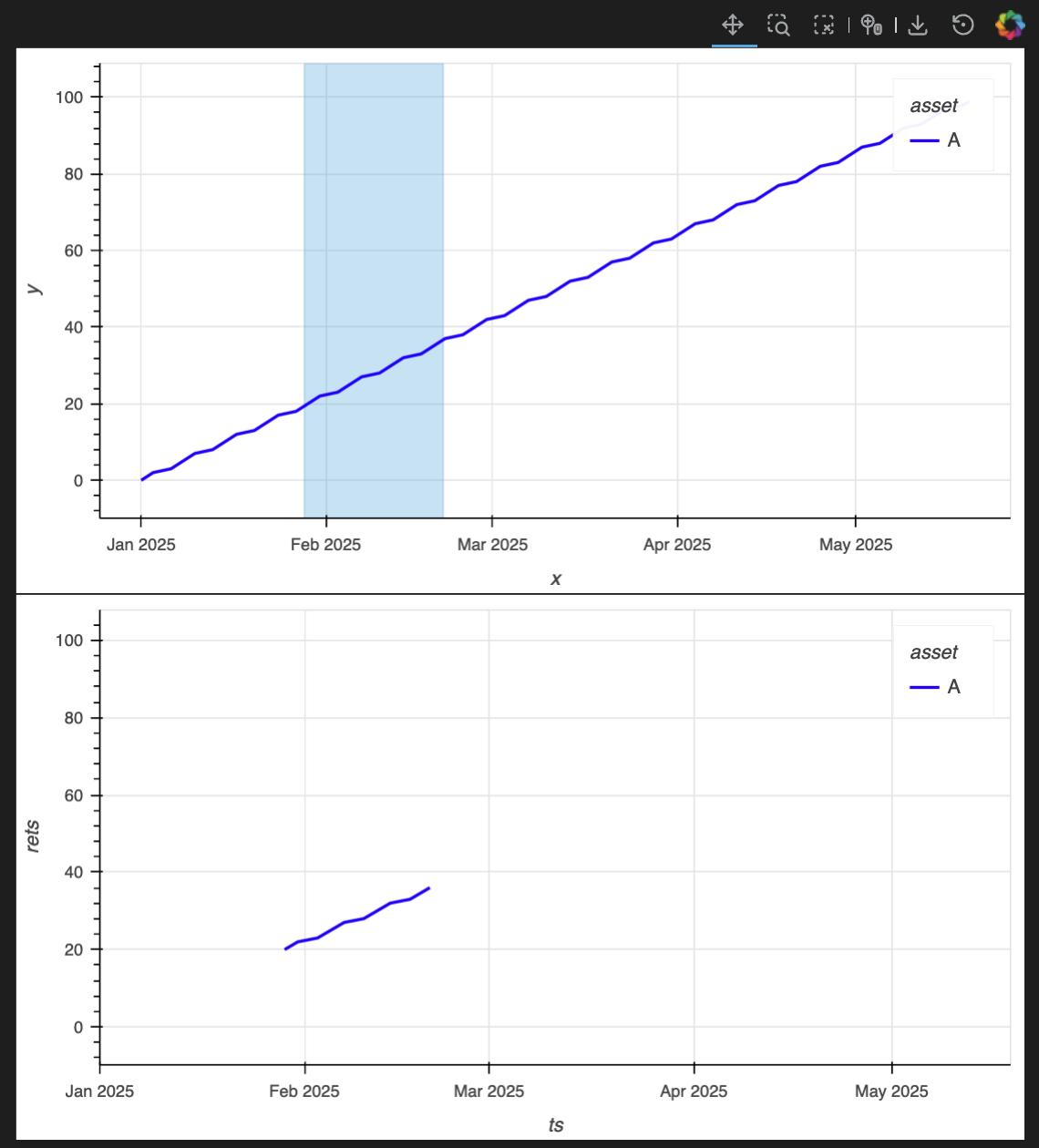 I have created a layout with two plots. The top plot show the full data and allows selection of a date range. The bottom plot is supposed to show just the data over the selected region. I would like the bottom plot’s x and y- limits to rescale to the data being shown. I can’t get this to work despite playing with shared_axes=False and framewise=True. Any help would be greatly appreciated!