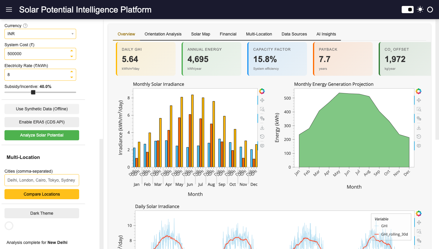 - Real solar radiation data from NASA POWER API (+ ERA5 cross-validation)